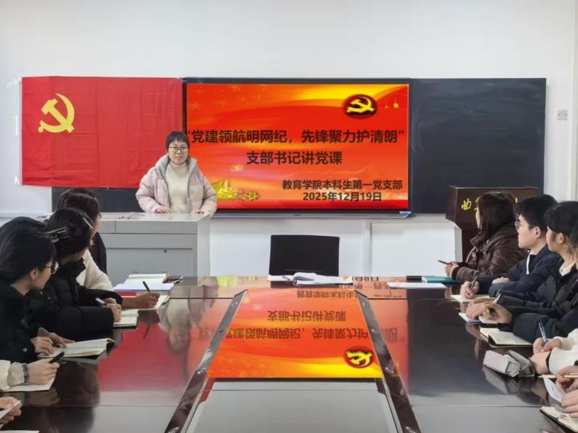 本科生第一党支部书记王保英于学院305会议室为支部党员讲授“党建领航明网纪,先锋聚力护清朗”专题党课。