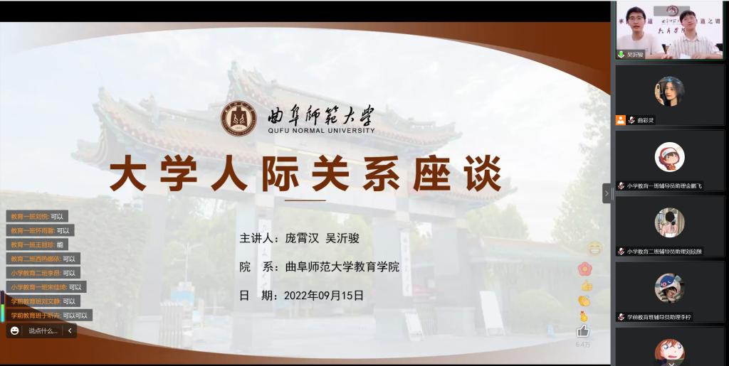 学生会原主席2019级学生庞霄汉、原副主席吴沂骏同学,与2022级新生齐聚线上,结合自身学习生活体会,介绍了大学生在宿舍里如何与舍友相处、在学生会中如何与老师和同学相处,以及大学生的恋爱问题。讲座氛围轻松活泼,同学们在评论区讨论热烈,纷纷表示听了讲座后收获了很多人际交往的小技巧。
