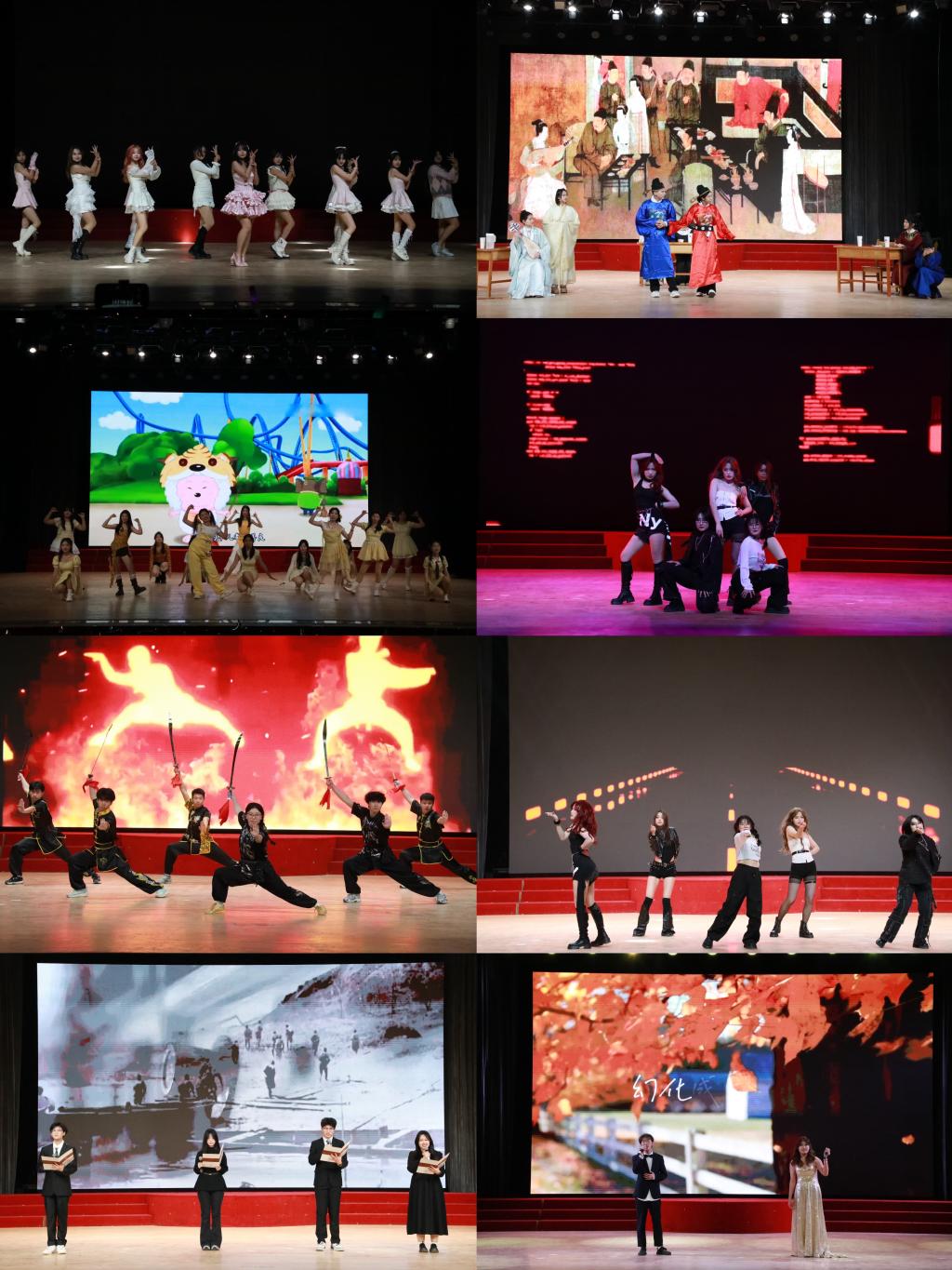 晚会在歌曲《勇往直前》的欢快旋律中拉开序幕,瞬间调动全场氛围,迸发满场青春活力;舞蹈《Panorama》《Dejia Yu》《Abracadabra》《童梦奇旅》风格各异,翩跹舞姿中尽显曲园学子的蓬勃朝气与青春意趣;相声《卖火柴的小女孩》、小品《Hi jack》《夜宴》包袱迭出、幽默风趣,亦庄亦谐间引发全场共鸣与满堂喝彩;配音《声入人心》创意十足,走秀《摩登派对》气场全开,歌曲《落叶归根》深情款款,武术《武韵风华》刚劲有力……这些节目共同展现了青年创意、时尚自信、温暖情怀与文化魅力,唤起了师生集体共鸣。