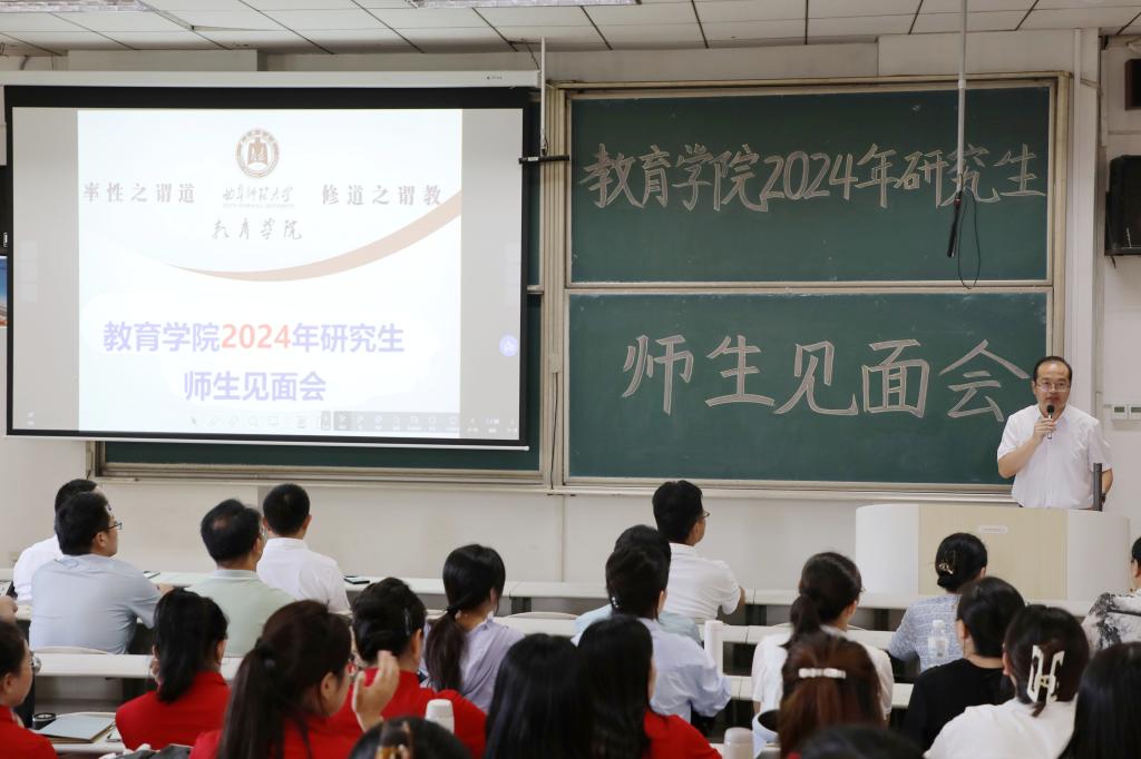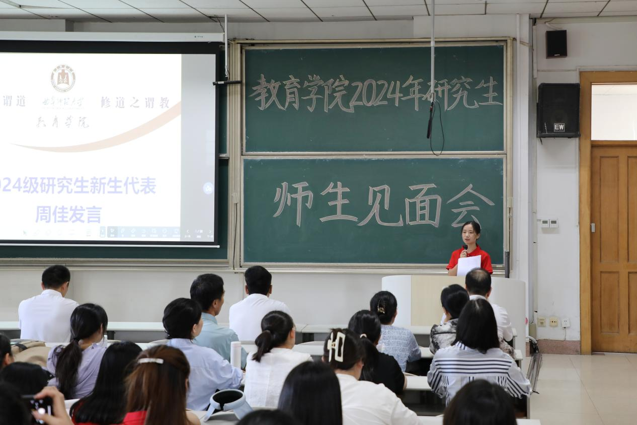 2023级硕士研究生代表教育学原理专业硕士生谢依瞳、2024级研究生新生代表教育学原理专业博士生周佳依次发言,表示将在研究生生涯中不断探索教育界的新领域、新问题,为教育学术理想而不懈努力。