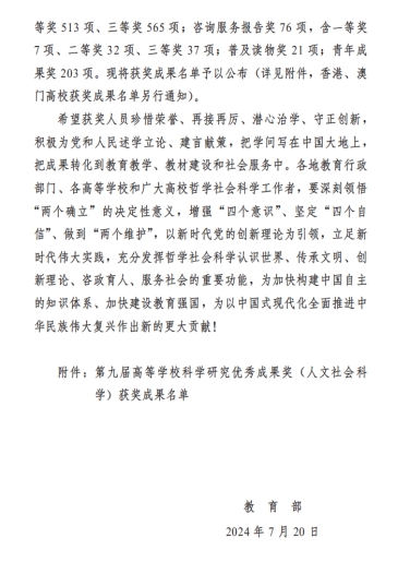 教育部人文社科奖于1995年首次设立,是目前我国人文社科领域最具公信力和权威性的重要奖项,也是我国人文社科类成果的最高奖项,旨在表彰在高校人文社会科学研究中做出突出贡献的研究人员,展示高校人文社会科学界服务党和国家事业发展的重大理论与实践成果,推动高校哲学社会科学高质量发展。