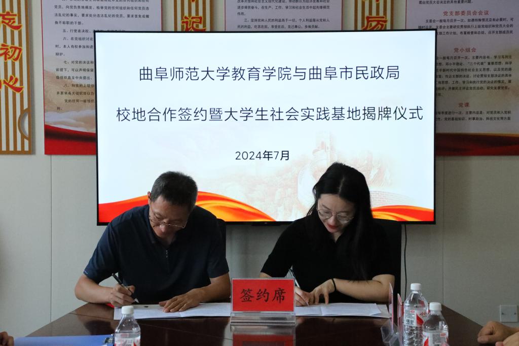 张东霞与曲阜市民政局党组成员、副局长孔维健代表双方签订合作协议。