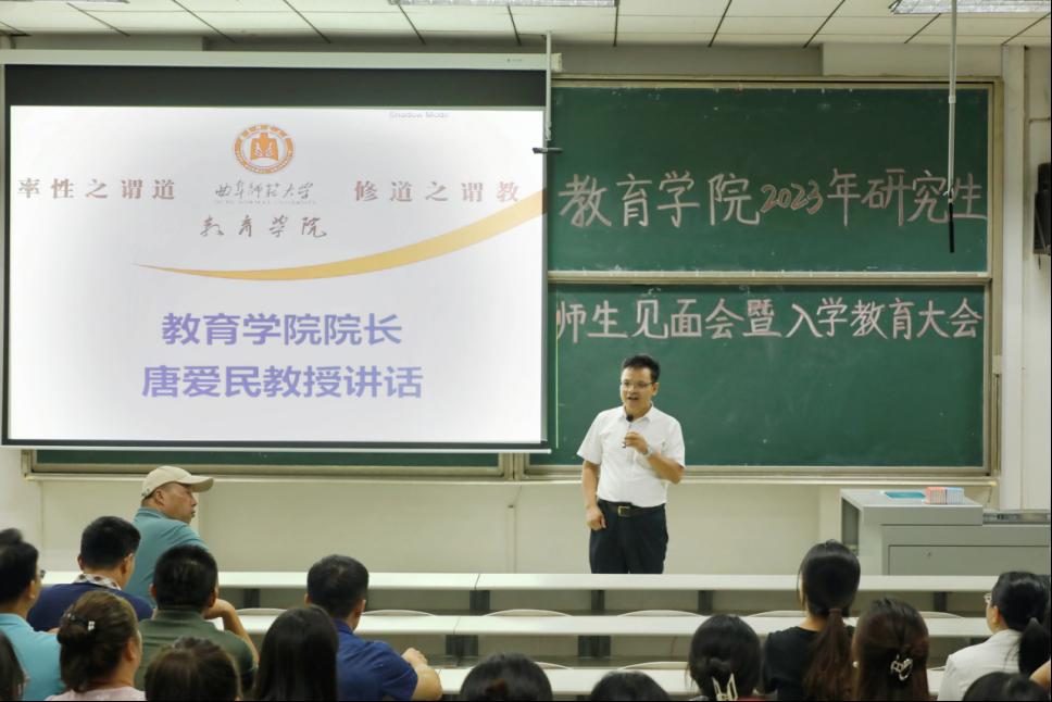 的发展历程,并就学院学科建设、办学成果等方面作了详细介绍,向同学们展示了学院雄厚的科研实力和优秀的师资队伍。唐院长以“四个学会”勉励同学们认真对待学术研究,希望同学们学会阅读、学会写作、学会交流、学会坚持,追求卓越,不懈进取,书写学术风采。