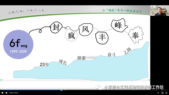 王立新老师以“一名农村教师的专业发展与综合实践‘突围’之路”为题,以“封”“疯”“风”“丰”“峰”“奉”六个字概括分享了自己的专业成长与综合实践活动“突围”之路。其中,“封”是指从事教学工作的第一个十年开始的“封闭”学习研究之路,在这十年间,他相继创建了“生活教育法”、信息技术“5TS商业教学模式”和“综合实践1153教学法”等教学模式;“疯”描述了他在专业成长和研究创新之路中,“爱折腾”和坚持不懈的性格;“风”描绘了他像风一样飘摇参加全国各地的教育培训活动,参加全国各地的巡讲活动;“丰”代表着他在小学综合实践活动创新之路中积累的累累硕果;“峰”指向王老师怀揣的教育理想——即攀登教育的“山峰”,登上教书育人的“义”峰,特级教师的“术”峰,齐鲁名师的“道”峰;“奉”则表达了王老师对教育的奉献精神与爱的情怀。