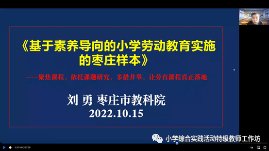 刘勇老师以“基于素养导向的小学劳动教育实施的枣庄样本”为主题,将政策解读与实践感悟相结合,系统地介绍了劳动教育的内涵、价值追求与定位。他指出,劳动教育是“论”的学问,更是“做”的智慧。随后,刘勇老师结合枣庄市推进劳动教育实施的典型案例,总结提出校本化劳动课程实施的七条策略:一是深研政策文件,厘清课程定位,明晰教研职责;二是整合创新,打造区域,校本化劳动课程体系;三是抓实课堂,基于教学评一致性,开展课堂达标活动;四是组建名师队伍,让兼职教研员发挥示范作用;五是科研引路,生活化劳动教育课题探索劳动教育实施策略;六是“技能交换”提升专兼职教师队伍专业技能素养;七是课程评价是劳动教育课程真正落地的指挥。