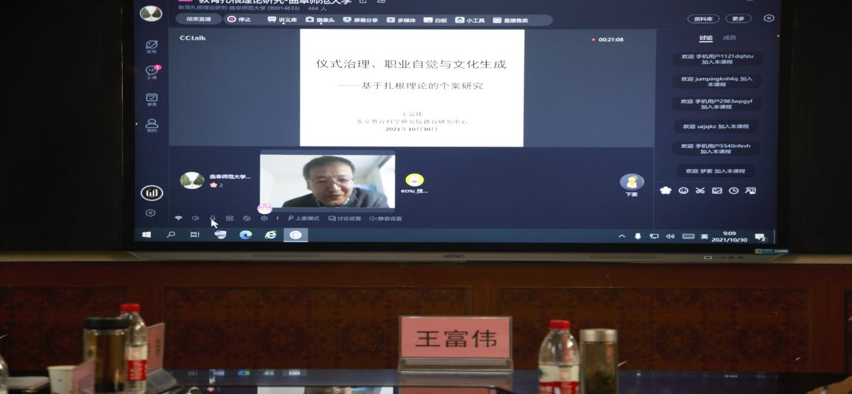 我院邀请到北京教育科学研究院德育研究中心学术委员会主任王富伟研究员做了题为《仪式治理、职业自觉与文化生成——基于扎根理论的个案研究》的主旨报告,王富伟研究员分享了个人研究案例并同与会人员进行了互动。王富伟研究员的报告细致、深入,使得与会人员对扎根理论研究有了更加深入的理解。