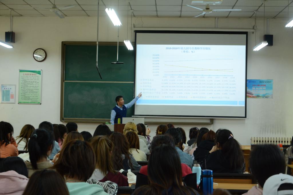 报告中,张升峰老师运用丰富详实的数据和案例向同学们介绍了学前教育发展的相关政策文件、现实状况和未来前景。他首先介绍了国务院颁发《关于当前发展学前教育的若干意见》以来十年间中国学前教育跨越发展的状况与特点,如资源迅速扩大,表现为全国幼儿园园所数量、全国在园幼儿数量、全国幼儿园教师数量的持续上升;普及水平大幅提升;投入力度明显加大;管理制度不断完善,确定了“国务院领导、省市统筹、以县为主”的管理体制,建立了教育部门主管、各有关部门分工负责的工作机制等。然后,他指出了当前学前教育发展存在的现实问题,包括普及性资源供给不足,公办园数量下降,民办园占比上升;投入机制不完善,对学前教育的财政投入占比偏低、成本分担机制不健全、政策性投入落实不到位;教师队伍建设滞后,存在教师总量不足、学历和待遇偏低等问题;民办园存在高收费、低成本运行、资本运行上市直接敛财等过度逐利问题;存在监管体系不完善的问题。张老师指出,虽然存在很多问题,但学前教育专业有着美好的前景,特别是中共中央、国务院《关于学前教育深化改革规划发展的若干意见》的颁布,意味着学前教育发展进入了新的时期,张老师通过带领同学们详细学习文件要求,使同学们感受到,作为学前教育专业的学生,肩负着教育关爱幼儿,托举起学前教育发展明天的重任,学好专业未来必大有可为、大有作为。