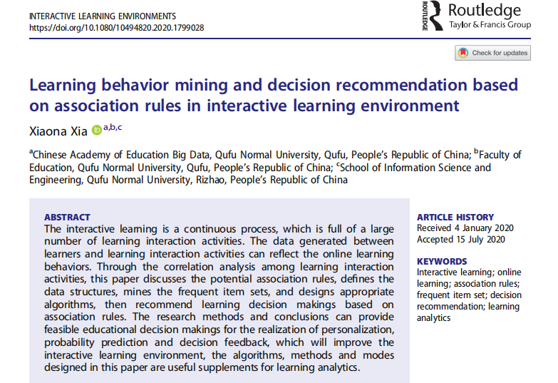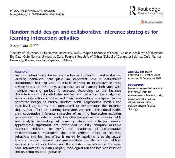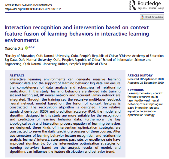 博士生夏小娜的论文《Learning behavior mining and decision recommendation based on association rules in interactive learning environment》(学习交互环境中基于关联规则的学习行为挖掘和决策推荐,WOS:00055562600001)、《Random Field Design and Collaborative Inference Strategies for learning interaction Activities》(学习交互活动的随机场设计与协作推断策略,WOS:000603838500001)以及《Interaction Recognition and Intervention Based on Context Feature Fusion of Learning Behaviors in Interactive Learning Environments》(学习交互环境中学习行为上下文特征融合的交互反应识别及干预)三篇论文被国际期刊Interactive Learning Environments(SSCI,JCR: Q2,2019年IF=1.938)接收,并分别于2020年8月4日、2020年12月30日和2021年1月15日提前在线发表。