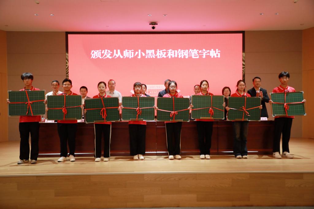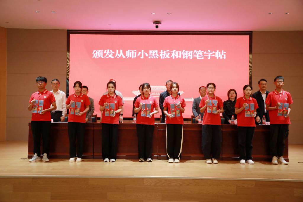 随后,领导老师们为2025级新生代表颁发从师小黑板和钢笔字帖,并希望同学们能够领会学院的良苦用心,勤学苦练,牢记老师们的谆谆教诲,在日常学习中打磨教学基本功,努力提升教学实践能力。