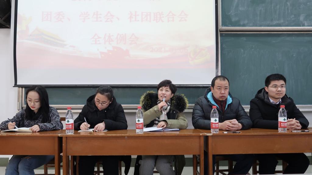 2021届团委、学生会、社团联合会全体例会于综合楼701顺利召开。出席本次会议的领导老师有团委书记周长缨、辅导员王保英、贺现网、赵旭涛以及2021届团委、学生会、社团联合会全体成员。本次会议由学生会主席金龙梅主持。