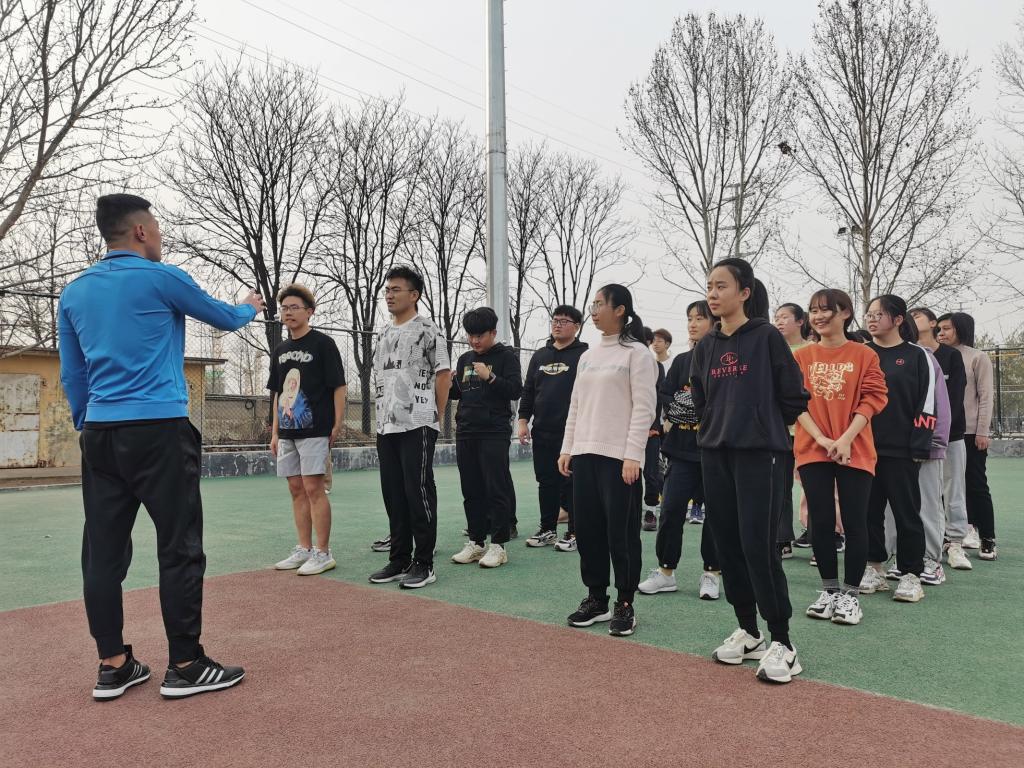 团委书记周长缨、2017级辅导员贺现网、学生会主席金龙梅来到西操场鼓舞动员春训成员。