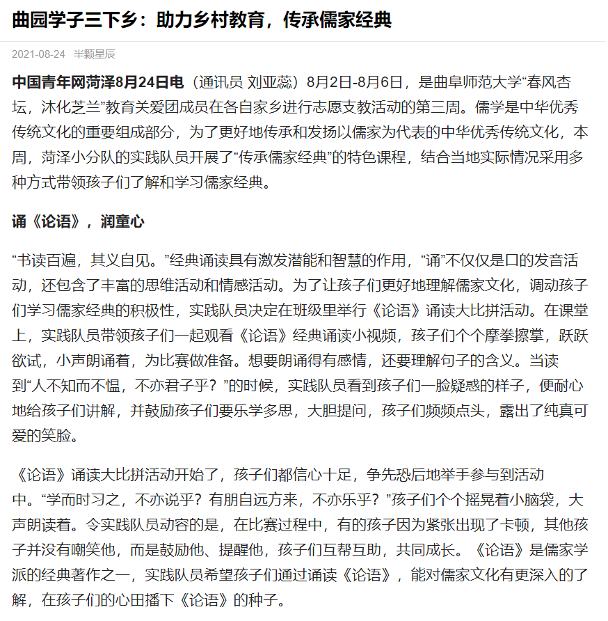 中青网:曲园学子三下乡:助力乡村教育,传承儒家经典