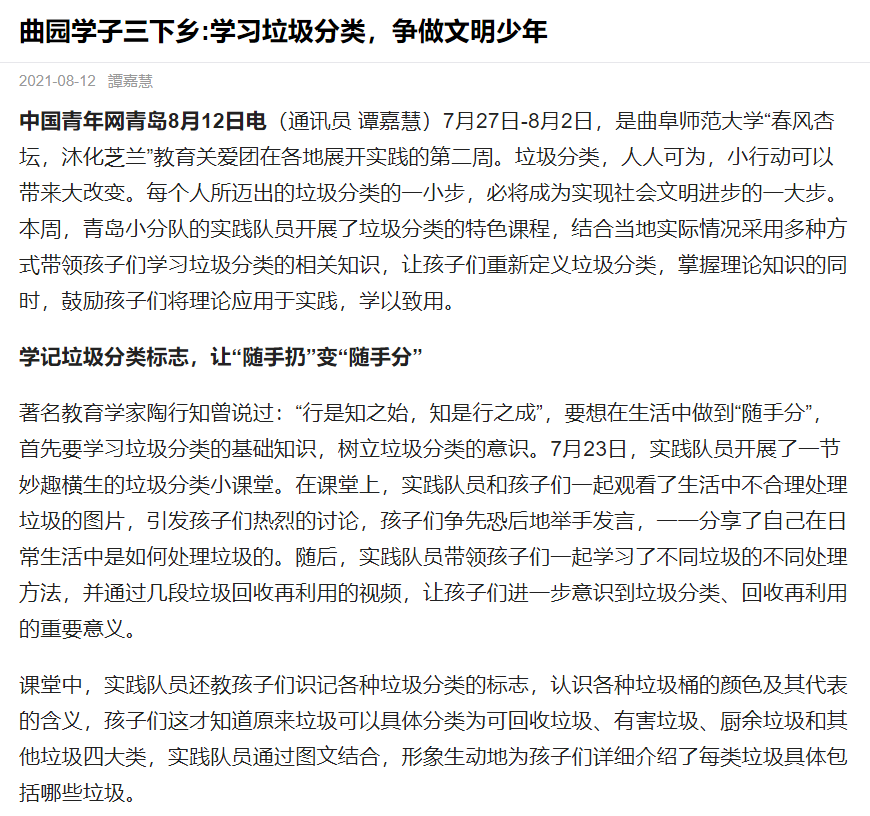 中青网:曲园学子三下乡:学习垃圾分类,争做文明少年