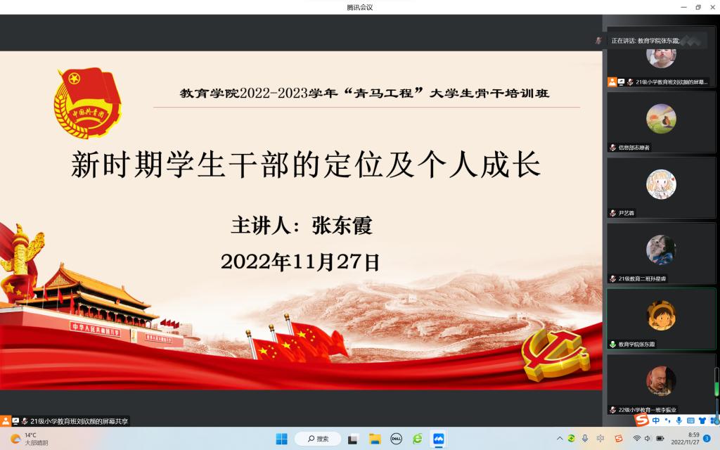 张东霞老师以“新时期学生干部的定位及个人成长”为题,围绕学生干部的定位和个人成长两个方面,结合学生工作实践展开讲述,对学生干部进行思想教育,并提出工作要求。她强调,学生干部要摆正心态、不忘初心、牢记使命,从点滴小事做起,不断提高自身素质、提升承载能力,展现出学生干部最好的精神面貌。她希望全体学生干部在提升自身工作能力和综合素养的基础上养成良好的学习习惯,保持优异的学习成绩,发挥好学生干部的榜样表率作用。