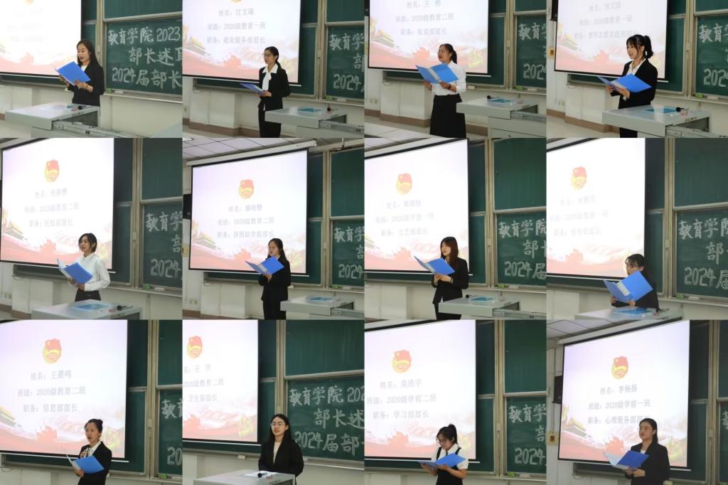2023届团委学生会各部门部长依次上台述职,总结任职以来的收获与成长,分享三年学生会工作经验和体会,强调“责任”与”传承“的重要性,同时表达了对学院和老师们的感激之情,并希望下一届学生会团结一心、坚持热爱、履职尽责、锻炼成长。