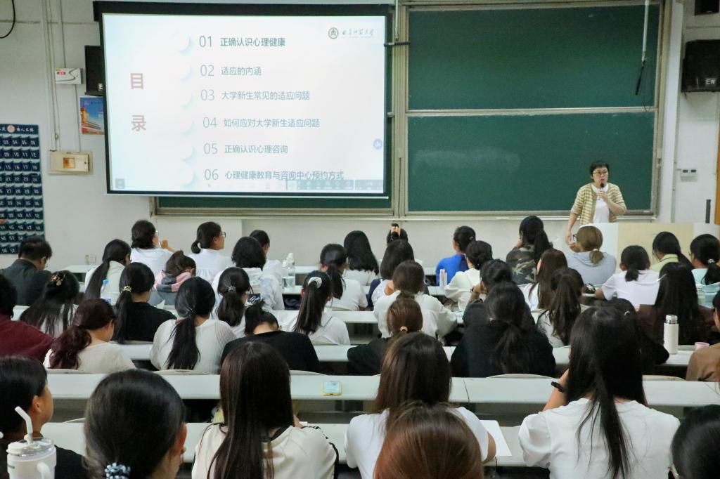 讲座伊始,王保英老师就心理健康的定义作了详细的介绍。随后她以“适应”的内涵为切入点,围绕大学新生常见的适应问题,结合简单的案例,引导学生正视心理压力,积极应对学习生活的挑战。同时,王老师强调要对心理咨询保持开放态度,正视自身的心理困扰,希望同学们可以保持积极的心态,不断提升自身的心理调适能力,健康快乐地度过大学生活。