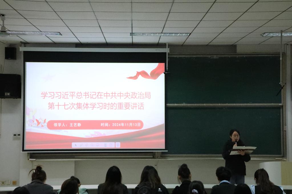 团委组织部副部长王艺静带领全体成员学习《习近平总书记在中共中央政治局第十七次集体学习时的重要讲话》,帮助大家深入了解2035年建设文化强国的战略目标,增强文化自信,促进在座师范生的自我提升与学习进步。