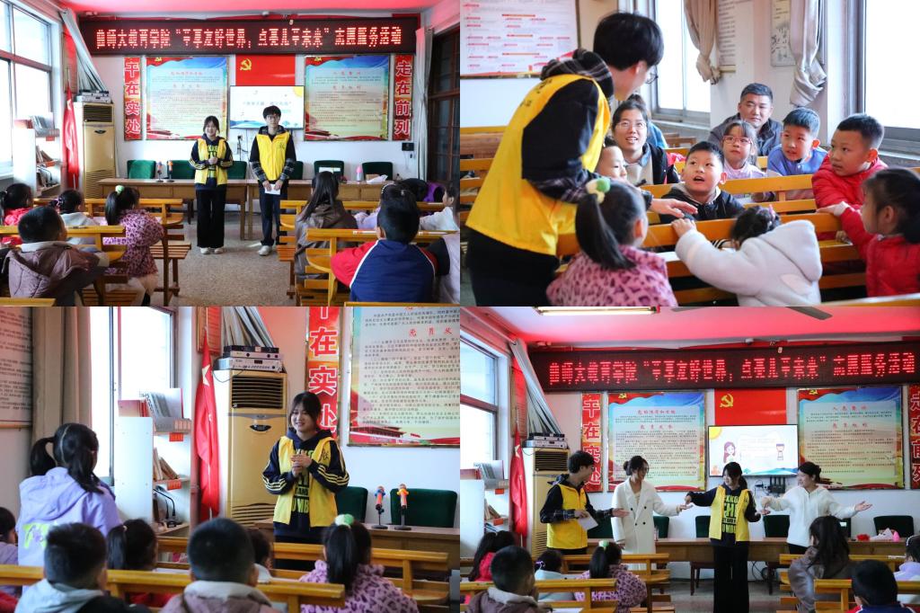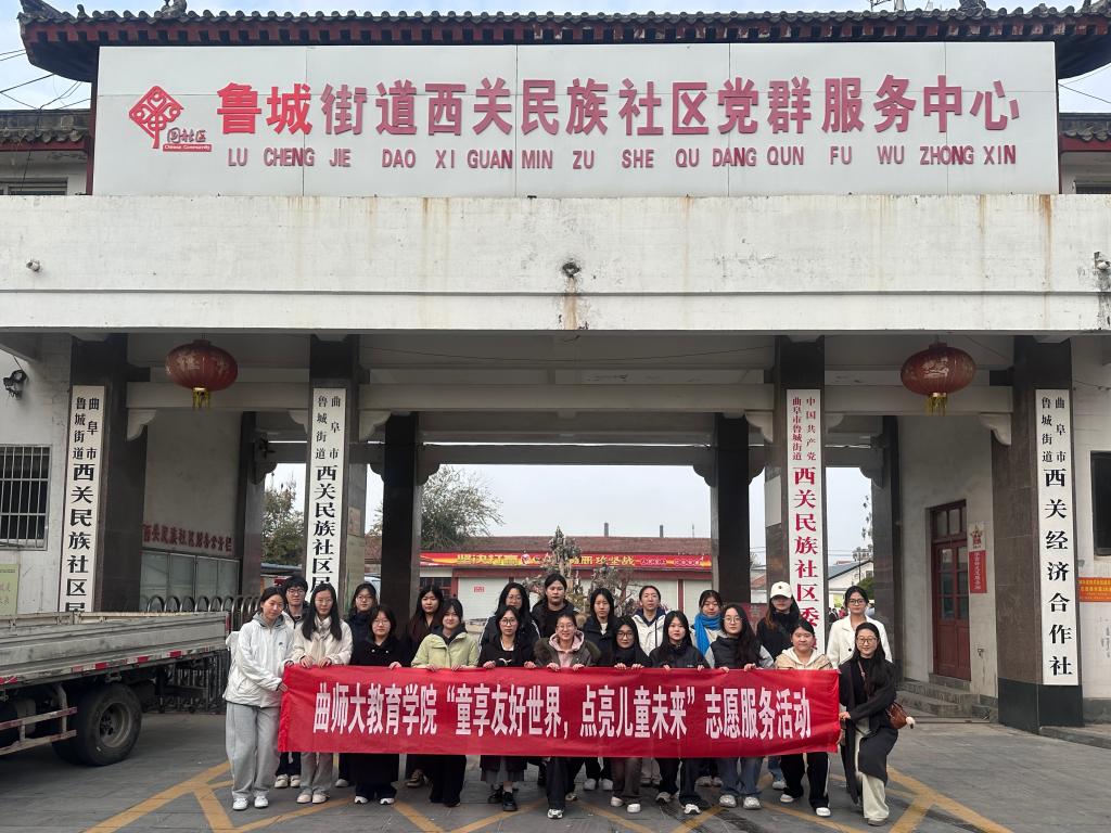 青年志愿者走进曲阜市鲁城街道西关社区,开展“童享友好世界,点亮儿童未来”志愿服务活动。开车漫画
