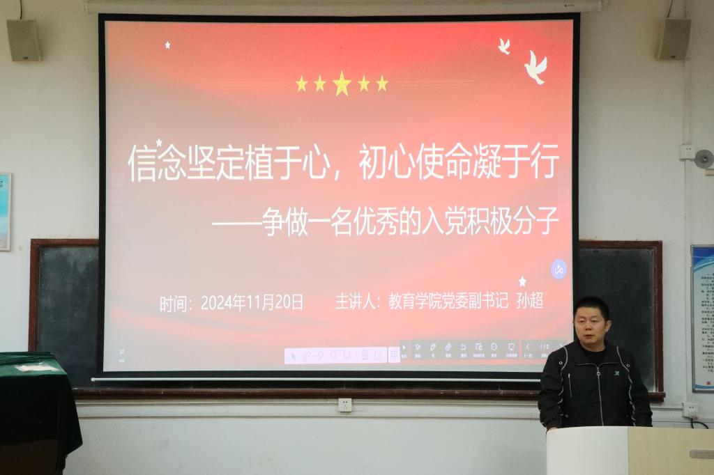 会上,孙超以《信念坚定植于心,初心使命凝于行——争做一名优秀的入党积极分子》为题,向各位学员指出了入党积极分子培训的重要意义,并对坚定理想信念、端正入党动机、取得培训实效、争做优秀入党积极分子提出了希望和具体要求。他指出,希望学员们通过这次培训,能够进一步端正入党动机、提高政治觉悟和理论素养,更好地理解党的路线、方针、政策,提高政治敏锐性和政治判断力,确保在思想上、政治上和行动上同党中央保持高度一致,为今后更好地发挥先锋模范作用、早日加入党组织打下坚实基础。