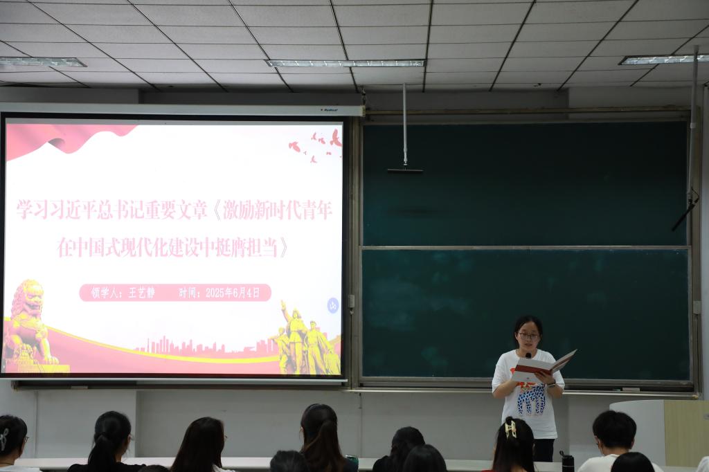 会上,学院团委组织部副部长王艺静带领全体成员学习了习近平总书记重要文章《激励新时代青年在中国式现代化建设中挺膺担当》,号召大家坚持党的领导,为强国建设和民族复兴积极贡献力量。