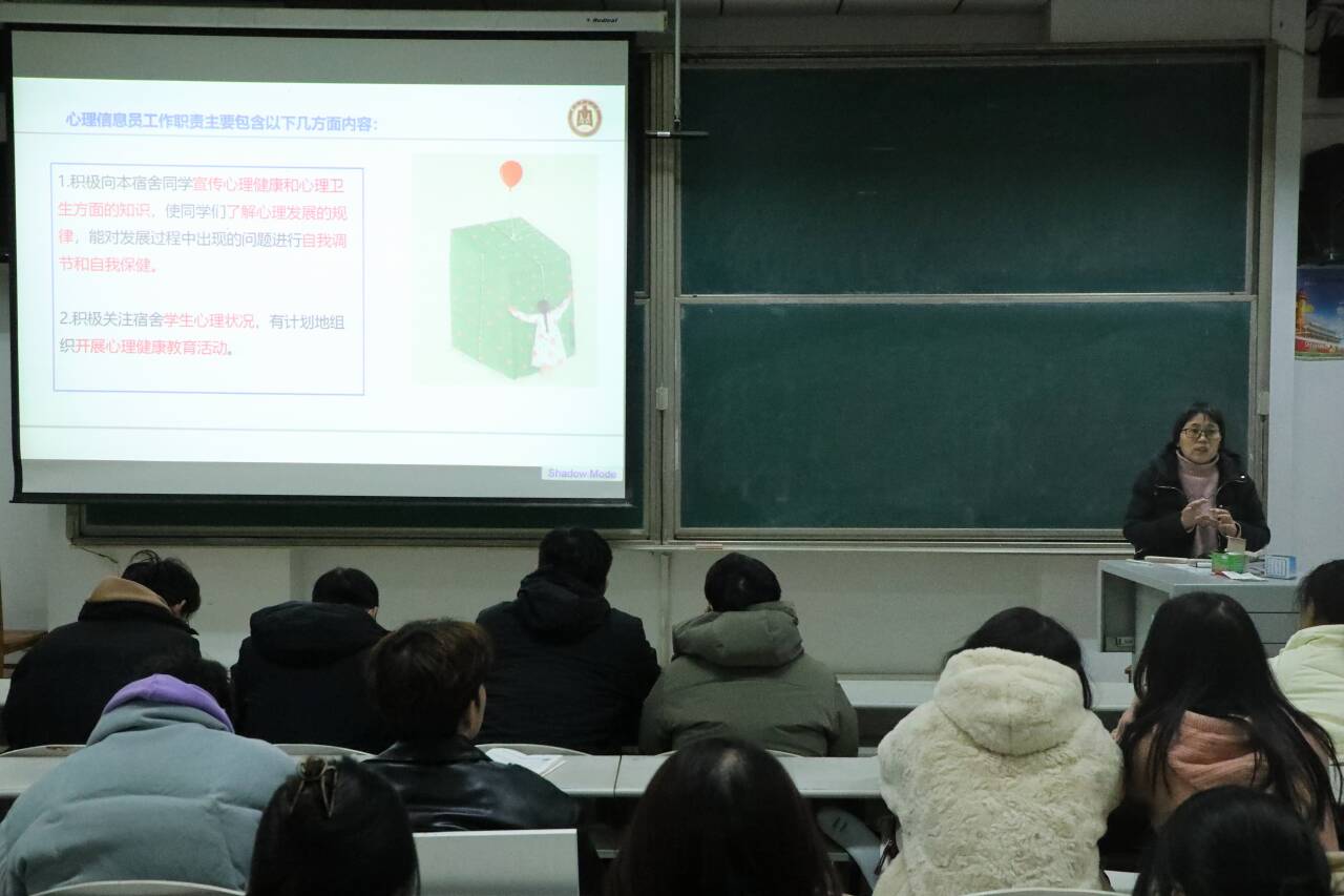 此次培训分为心理信息员的职责、大学生常见心理问题的识别、大学生常见心理问题的应对、心理信息员自我调节与成长四个部分。王保英老师结合实际生活中的具体案例向同学们讲解心理健康知识,帮助学生更好地了解和认识自身及他人的心理状态,提高心理健康水平。同时,她还希望大家主动留意关心身边同学的心理状态,加强彼此之间的沟通交流,为存在或可能存在心理问题的同学提供帮扶支持并及时进行心理疏导,把好宿舍心理健康第一关。