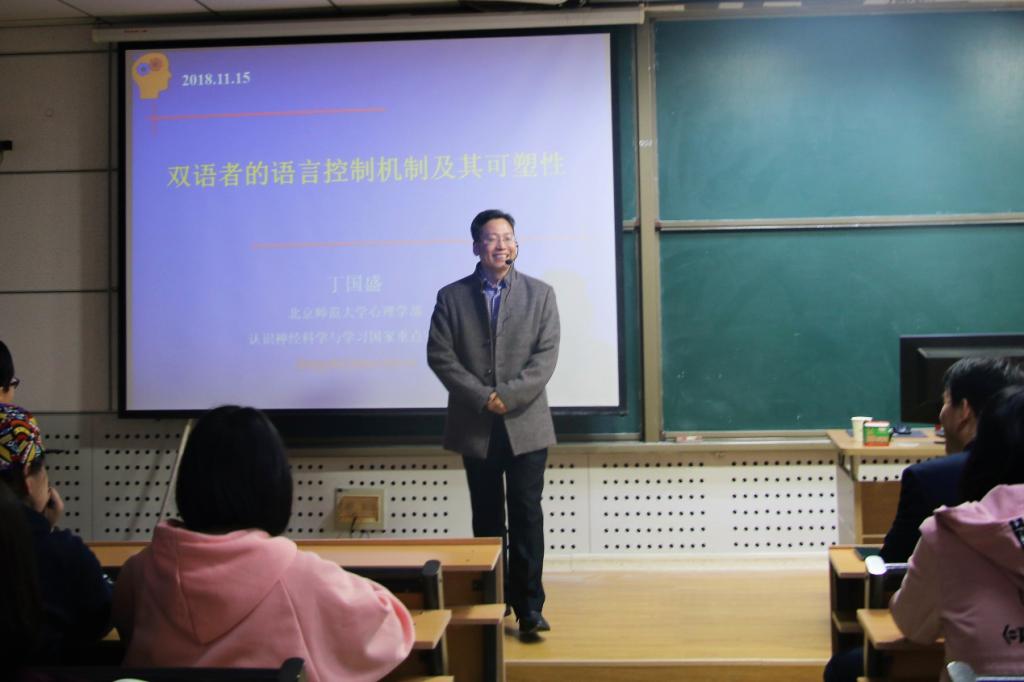 2018年11月15日下午,应我院邀请,北京师范大学心理学部教授,博士生导师,“认知神经科学与学习”国家重点实验室研究人员丁国盛教授在8号教学楼415教室作了题为“双语者的语言控制机制及其可塑性”的心理学学术报告。报告由我院副院长徐瑞主持,我院研究生、本科生参加了本场报告。