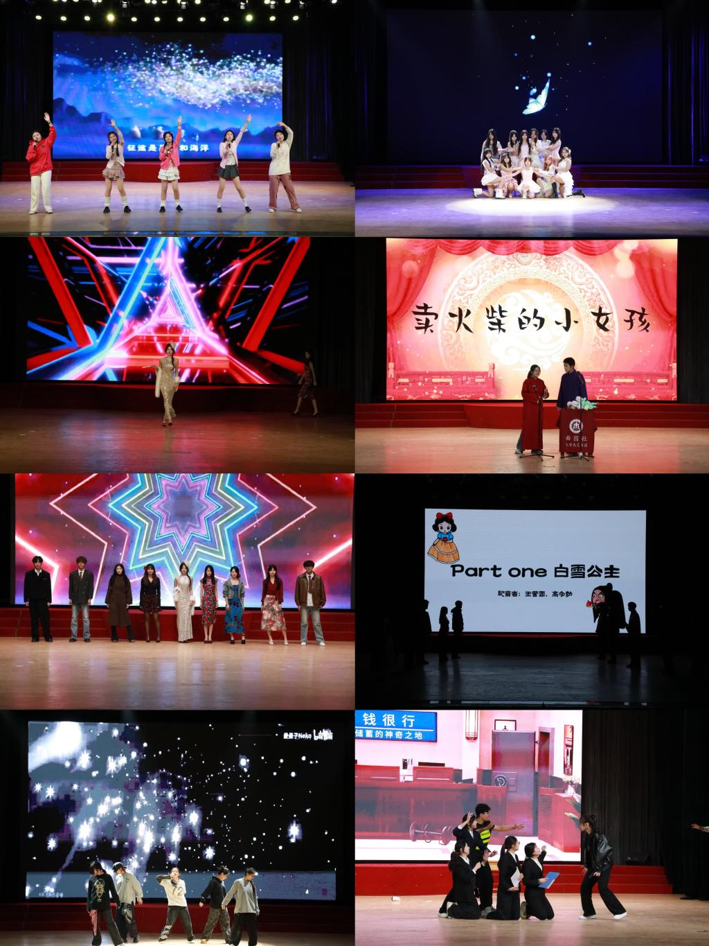 晚会在歌曲《勇往直前》的欢快旋律中拉开序幕,瞬间调动全场氛围,迸发满场青春活力;舞蹈《Panorama》《Dejia Yu》《Abracadabra》《童梦奇旅》风格各异,翩跹舞姿中尽显曲园学子的蓬勃朝气与青春意趣;相声《卖火柴的小女孩》、小品《Hi jack》《夜宴》包袱迭出、幽默风趣,亦庄亦谐间引发全场共鸣与满堂喝彩;配音《声入人心》创意十足,走秀《摩登派对》气场全开,歌曲《落叶归根》深情款款,武术《武韵风华》刚劲有力……这些节目共同展现了青年创意、时尚自信、温暖情怀与文化魅力,唤起了师生集体共鸣。