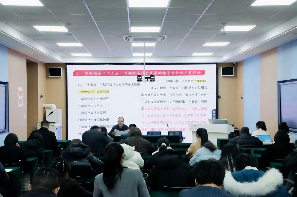 尹树林围绕全会精神的核心要义、重大部署和实践要求进行了全面解读。他指出,党的二十届四中全会是在即将进入基本实现社会主义现代化夯实基础、全面发力的关键时期召开的一次十分重要的会议。要把学习好贯彻好党的二十届四中全会精神作为当前和今后一个时期的重大政治任务,全面认识全会的重要意义,准确把握“十五五”时期重要地位,深刻领会、全面理解“十五五”时期经济社会发展的指导方针、主要目标、战略任务、重大举措,按照上级党委部署,结合学院工作实际,做中国式现代化建设的坚定行动派、实干家,一步一个脚印朝着强国建设、民族复兴的宏伟目标奋勇前行。